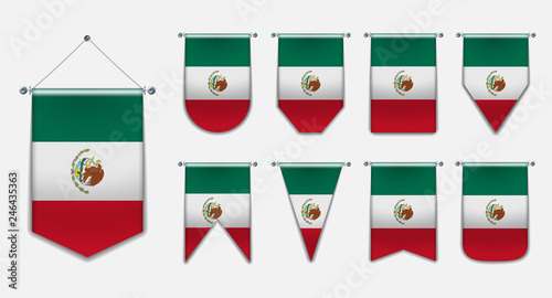 Set Of Hanging Flags Of The Mexico With Textile Texture Diversity Vertical Isolated 3d Shapes Of The National Flag Of Country Vertical Template Pennant For Background Banner Web Award Festival Buy This